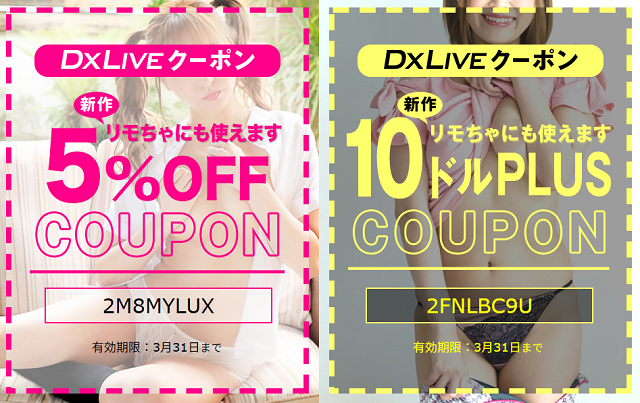 アダルトライブチャットのDXLIVEでは、2026年4月現在でお得な割引クーポンが発行されています。DXLIVEの割引クーポンを大きく分けると、「10ドルプラスクーポン」と「5%OFFクーポン」の2種類です。
